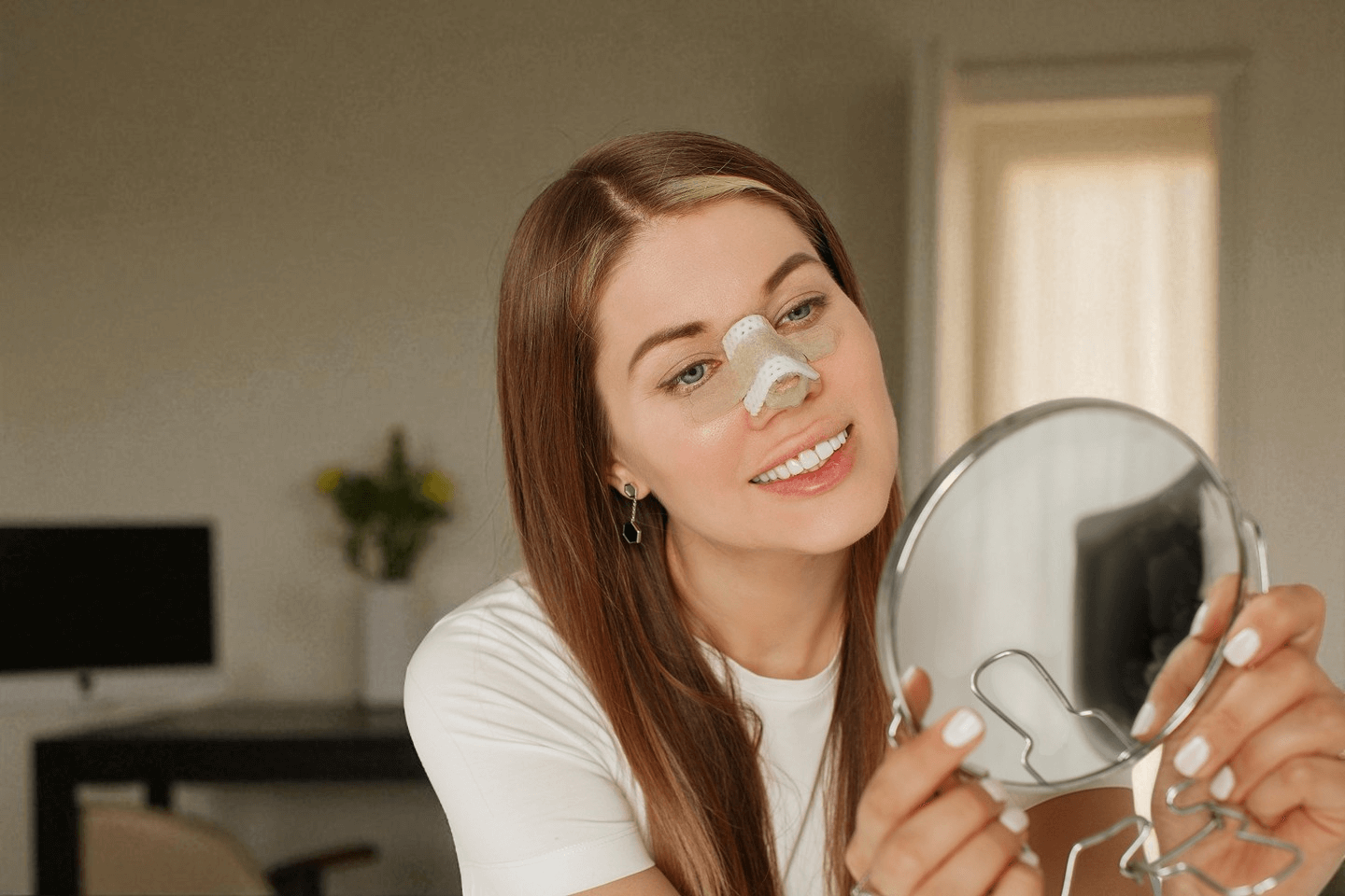 Ίσως παρατηρείτε ακόμη πρήξιμο, ήπιες εκχυμώσεις και ερυθρότητα. Αυτά υποχωρούν σύντομα, γι’ αυτό επικεντρωθείτε στη συνολική εικόνα και όχι στις λεπτομέρειες. Μπορείτε να χρησιμοποιήσετε μακιγιάζ μόλις αφαιρεθεί ο νάρθηκας, ενώ γύρω από τη μύτη επιτρέπεται και νωρίτερα, με ιδιαίτερη προσοχή ώστε να μην επηρεαστεί η θέση του.